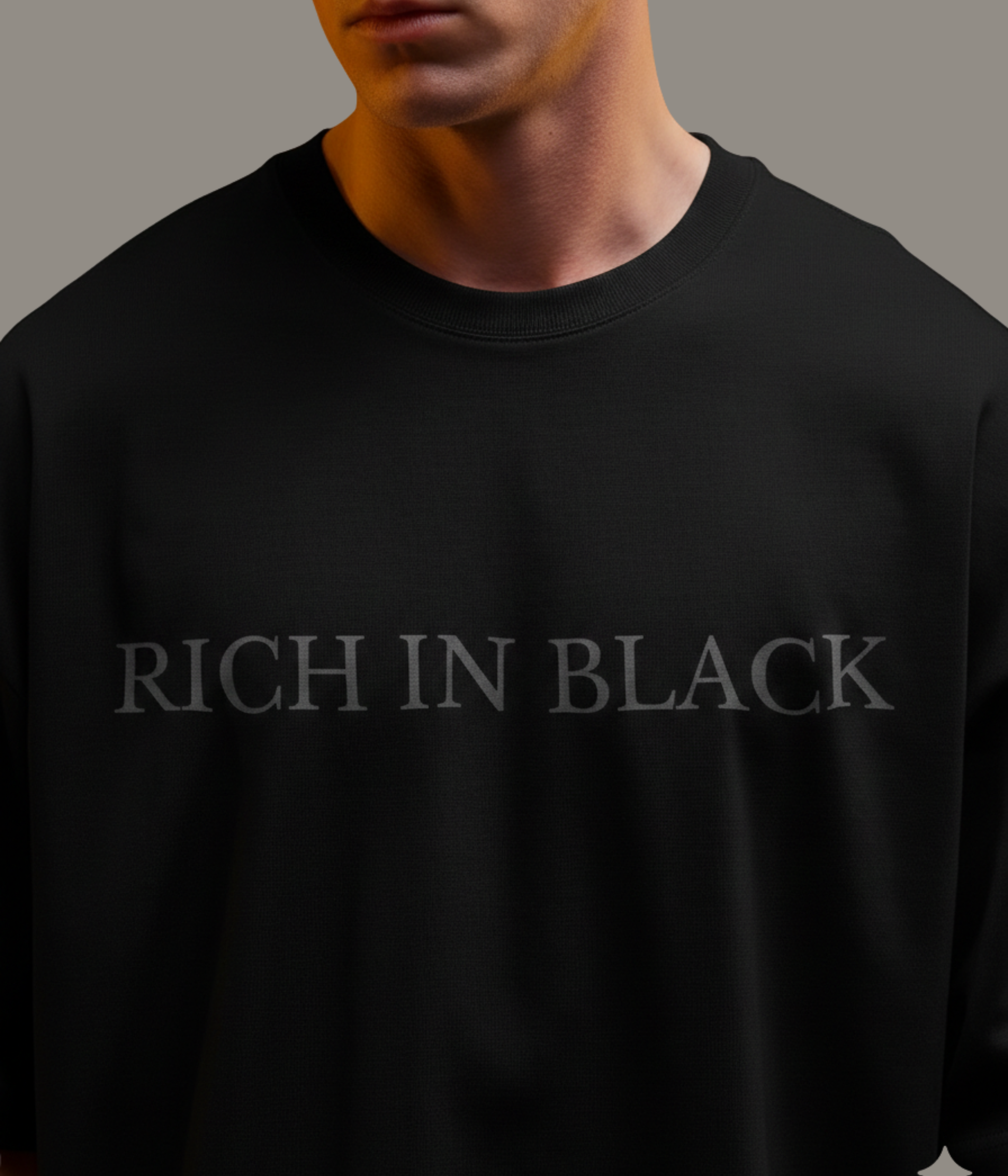 Design: Front chest features the signature RICH IN BLACK mark. Back neck subtly displays the article code: RIB–001 — a nod to exclusivity and authenticity.